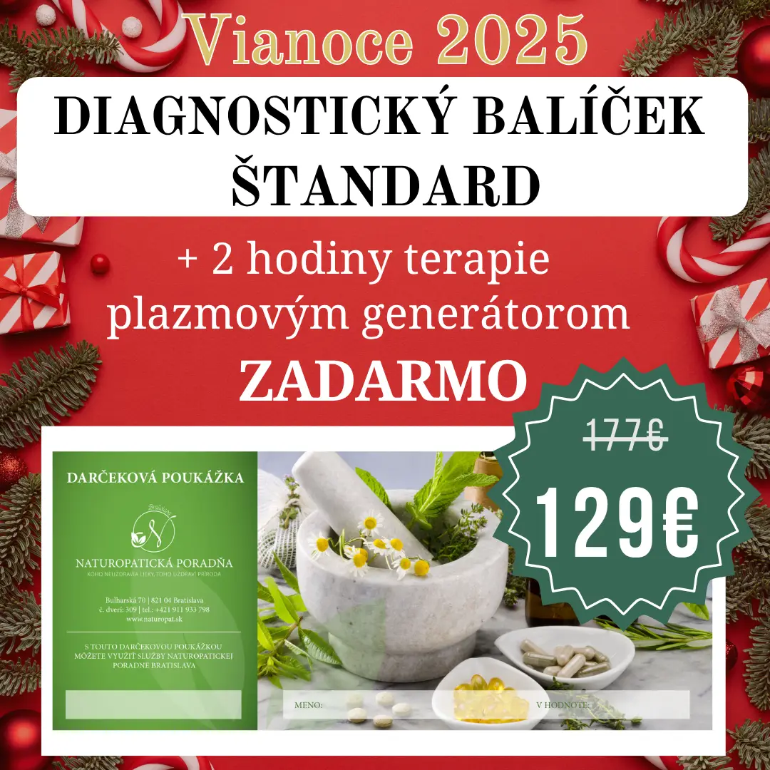 LEN ZA 129 eur, v hodnote 177 eur. Darčeková poukážka Naturopatickej poradne Bratislava diagnostický balíček Štandard plus 2 hodiny terapie plazmový generátor ZADARMO.  Darčekovú poukážku Vám môžeme poslať ako PDF súbor e-mailom, alebo  Vám ju vytlačíme a pošleme poštou.